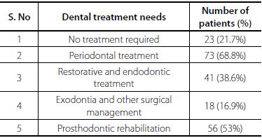 Study participants were assessed for the need of dental treatment. Approximately only 21% of the patients did not require dental treatment. Table 5 describes the specific treatment needs of the population studied.