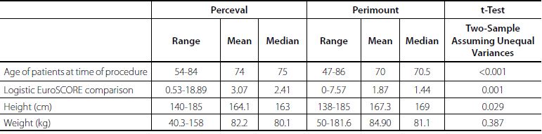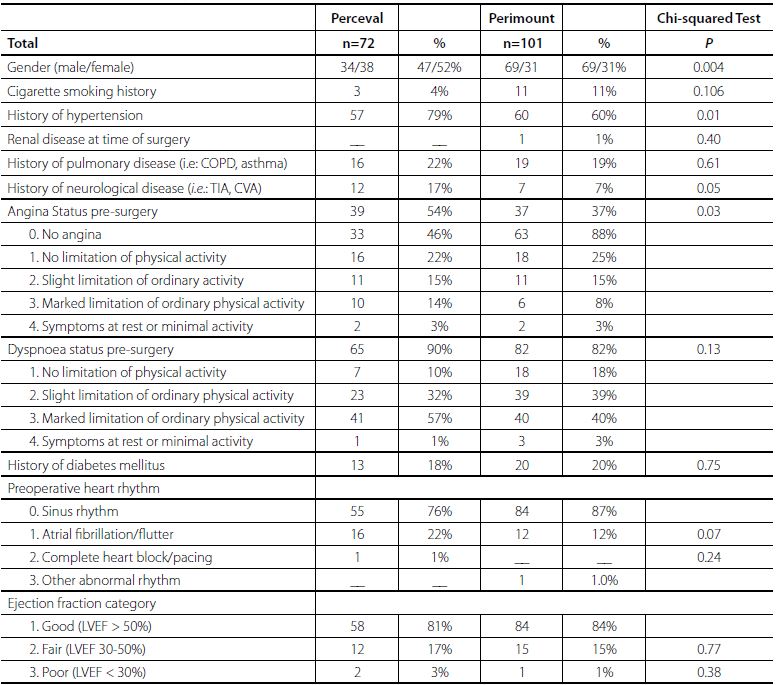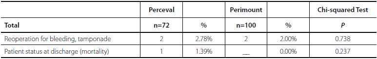 Greater number of L and XL size valves was implanted in Perceval valve group, and of 23 and 25 mm prosthesis in Perimount Magna Ease group (Table 3).