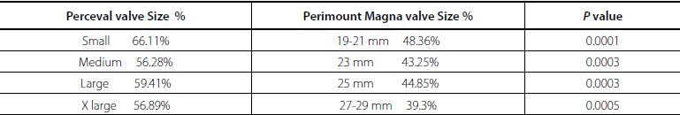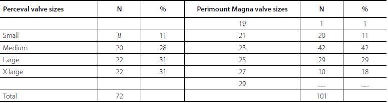 A total of 72 patients received isolated Perceval bioprosthesis and 101 patients had Perimount Magna Ease valve. The Percevel S valve sizes were small, medium, large and extra-large. For statistical purposes they were taken as equivalent to 19-21, 23, 25 and 27 mm Perimount Magna Ease sizes, respectively.