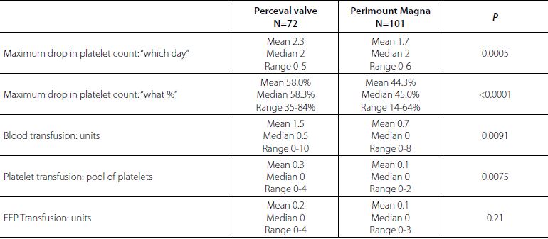 Conclusion: The implantation of sutureless Perceval aortic valves was associated with a significant drop in platelet count postoperatively with slow recovery and higher platelets and packed red blood cells transfusion requirements. A prospective randomised trial is needed to confirm our findings.