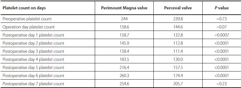 Van Straten et al.[14] compared thrombocytopenia after AVR with mechanical and biological valves. They concluded that patients undergoing AVR with the Carpentier-Edwards Perimount bioprosthesis or a Medtronic Freestyle stentless bioprosthesis had a lower minimum platelet count within the first five POD, compared to patients receiving ATS and St. Jude Medical mechanical prostheses.