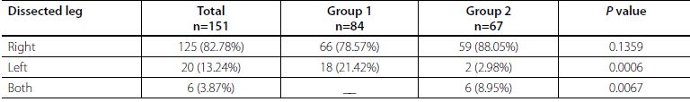 In most cases, in both groups, the right leg was selected preferentially, following the routine of the institution. The left leg was selected in Group 2, in the presence of visible varicosity in the right leg, and in Group 1, when the saphenous vein was considered inadequate and the criteria were predetermined.