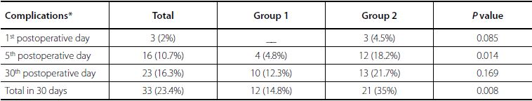 During follow-up, there were 4 (2.8%) deaths, all in Group 2 (P=0.036): a death in the 2nd postoperative day due to cardiogenic shock, a death in the 5th postoperative day, with cardiac arrest of unknown cause and 2 other patients during the 30-day follow-up whose exact cause was not able to be informed by the companion.
