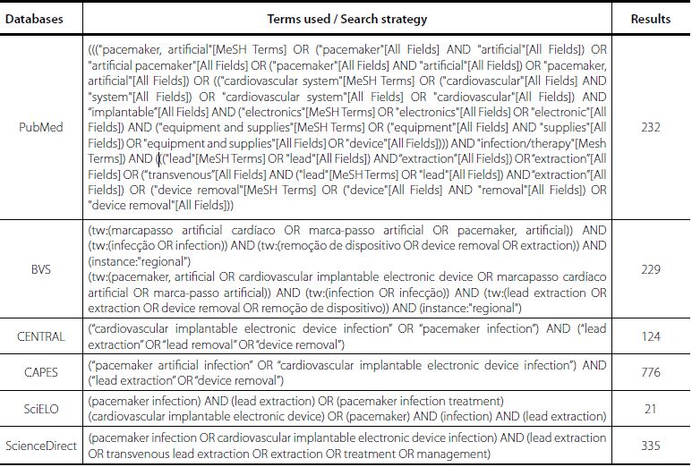 The search was carried out in August 2016. Initially, the studies were screened by an exploratory reading of the title and abstract by the two researchers, acting independently. The criteria for initial inclusion of the studies were delimited by Relevance Test I, namely: (1) primary studies, except for case reports; (2) approach for percutaneous lead extraction in cardiac implantable electronic device infections; (3) age 18 years and over; (4) articles published in English or Portuguese; (5) articles published between 2009 and 2016, as 2009 was the year of publication of a consensus of the Heart Rhythm Society approved by the American Heart Association, which unified the opinions and disagreements regarding the indications for device extraction, highlighting infection as one of the three major categories[10].