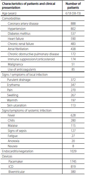 In that same study, it was estimated that the presence of systemic infection was associated with an approximately twice as likely chance of death as the initial presentation of local infection[26]. In Deharo et al.[(13] study, the one-year mortality rate did not present a statistically significant difference between the groups with local infection and endocarditis (12.5% and 15.5%, respectively).