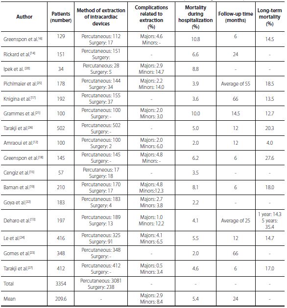Results: Sixteen studies, describing a total of 3,354 patients, were selected. Percutaneous extraction was performed in 3,081 patients. The average success rate for the complete percutaneous removal of infected devices was 92.4%. Regarding the procedure, the incidence of major complications was 2.9%, and the incidence of minor complications was 8.4%. The average in-hospital mortality of the patients was 5.4%, and the mortality related to the procedure ranged from 0.4 to 3.6%. The mean mortality was 20% after 6 months and 14% after a one-year follow-up.
