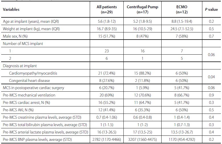 Studied risk factors included age, weight, gender, primary diagnosis (cardiomyopathies x CHD), univentricular heart physiology, type of primary MCS (ECMO x centrifugal pump), number of MCS implants, preoperative cardiac arrest, preoperative AKI, AKI during hospitalization, stroke, preoperative mechanical ventilation, systemic inflammatory response syndrome (SIRS), preoperative serum creatinine value, preoperative serum total bilirubin value, preoperative serum lactate value, preoperative serum brain natriuretic peptide (BNP) value, infection, major bleeding and circuit thrombosis.
