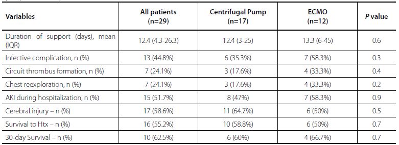 Results: Twenty-nine patients from our waiting list were assessed. Twelve (45%) patients were initially supported by extracorporeal membrane oxygenation (ECMO) and a centrifugal pump was implanted in 17 (55%) patients. Five patients initially supported by ECMO were bridged to another device. One was bridged to a centrifugal pump and four were bridged to Berlin Heart Excor®. Among the 29 supported patients, 18 (62%) managed to have a heart transplant. Thirty-day survival period after heart transplant was 56% (10 patients). Median support duration was 12 days (interquartile range [IQR] 4 - 26 days) per run and the waiting time for heart transplant was 9.5 days (IQR 2.5-25 days). Acute kidney injury was identified as a mortality predictor (OR=22.6 [CI=1.04-494.6]; P=0.04).