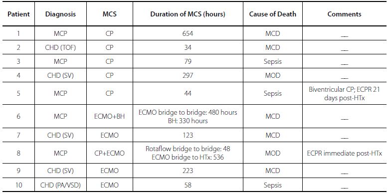 Our institution represents the largest Pediatric HTx Program in Latin America. We have performed an average of 17 pediatric and congenital HTx annually in the last five years, and our waiting list mortality, especially for the patients classified as INTERMACS 1 and 2, is higher than 80%[7,13]. Our MCS program is supported by our institutional fund and restricted to extracorporeal membrane oxygenation (ECMO) and centrifugal pumps (Rotaflow® - Maquet Getting Group, Rasttat, Germany).