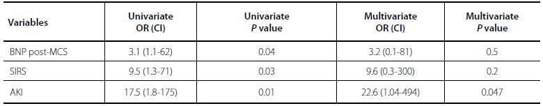 Regarding survival to hospital discharge, univariate analysis showed BNP over 1000 post-MCS, SIRS, and AKI as risk factors, but multivariable analysis and Binary logistic regression identified that only AKI during hospitalization was a predictive variable of mortality (OR=22.6 [CI=1.04-494.6]; P=0.04; Table 4).