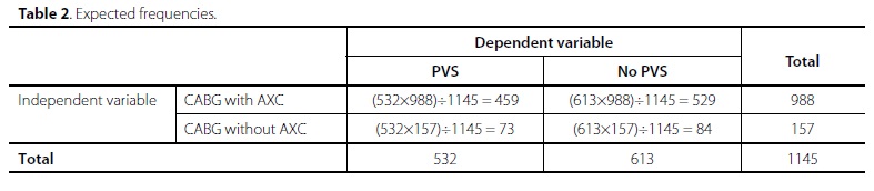To make the concept clearer, let's make use of a practical example. In a previous issue of the BJCVS, Dayan et al. analyzed the outcomes of coronary artery bypass graft (CABG) with and without aortic cross-clamp (AXC)[2]. One of the dependent variables analyzed by the authors was the need for postoperative prolonged ventilatory support (PVS). Among the 1145 patients undergoing CABG, 988 were submitted to AXC and 157 were not. For those submitted to AXC, 489 required PVS, while this number was 43 for the group without AXC.