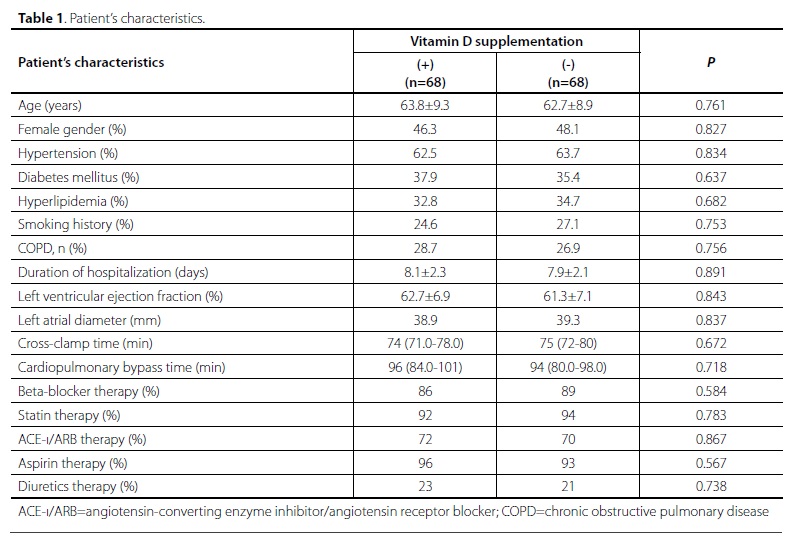 Methods: The study group consisted of 328 consecutive patients. The ınfluence of preoperative vitD supplementation on POAF was reviewed in 136 patients who underwent coronary artery bypass graft surgery with vitD insufficiency (n=80) and vitD deficiency (n=56). Patients were assigned to receive either oral vitD (50.000 U) (treatment group, n=68) or not (control group, n=68) 48 hours before surgery. Patients were followed up during hospitalisation process with respect to POAF.