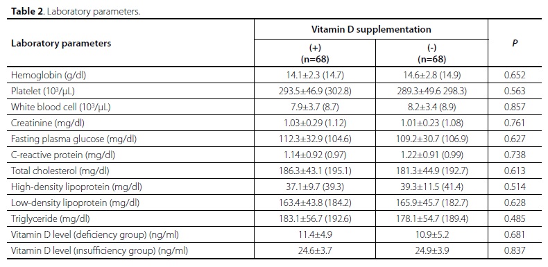 In addition, there was no significant difference between these two groups with regards to biochemical and haematological parameters, such as hemoglobin (14.1±2.3 vs. 14.6±2.8 g/dl, P=0.652), platelet (293.5±46.9 vs. 289.3±49.6 103/µL, P=0.563), white blood cell (7.9±3.7 vs. 8.2±3.4 103/µL, P=0.857), creatinine (1.03±0.29 vs. 1.01±0.23 mg/dl, P=0.761), fasting plasma glucose (112.3±32.9 vs. 109.2±30.7 mg/dl, P=0.627), C-reactive protein (1.14±0.92 vs. 1.22±0.91 mg/dl, P=0.738), total cholesterol (186.3±43.1 vs. 181.3±44.9 mg/dl, P=0.613), high-density lipoprotein (37.1±9.7 vs. 39.3±11.5 mg/dl, P=0.514), low-density lipoprotein (163.4±43.8 vs 165.9±45.7 mg/dl, P=0.628), and triglyceride (183.1±56.7 vs. 178.1±54.7 mg/dl P=0.485) (Table 2).