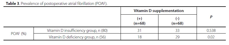 Conclusion: Although preoperative vitD supplementation was not found to be associated with prevention of POAF in patients with vitD insufficiency, it was found to be strongly associated with prevention of POAF in those with vitD deficiency.