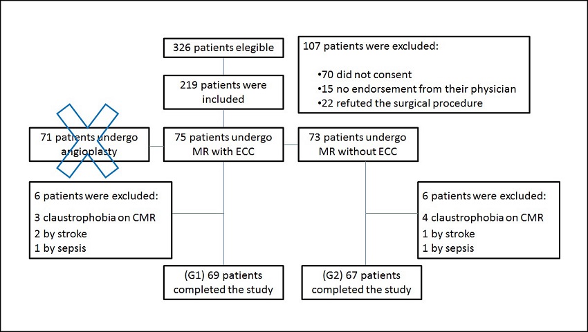 Of all these patients, 12 were excluded (7 for claustrophobia on cardiac magnetic resonance - CMR, 3 for stroke and 2 for sepsis). The remaining 136 patients were divided into 2 groups with 69 patients assigned to Group 1 and 67 to Group 2 (Figure 2). All participants in the study had blood samples collected for the analysis of glucose, triglycerides (TG), creatinine, total cholesterol (TC), high-density lipoprotein (HDL), low-density lipoprotein (LDL) and creatinephosphokinase (CPK) in the preoperative period. The samples of creatinephosphokinase MB (CKMB), troponin I (TnI) and US-CRP were collected in the preoperative period and after 6, 12, 24, 36, 48, and 72 hours from the surgery. The laboratory analysis provided the US-CRP that was analyzed in a univariate and bivariate way. We also analyzed in the preoperative biological variables of each patient [age, smoking, diabetes mellitus (DM), left coronary trunk lesion (LCT), body mass index (BMI), previous MI, myocardial fibrosis]. The presence of myocardial fibrosis was analyzed by CMR 2 days before surgery (F1= preoperative fibrosis) and 6 days after surgery (F2= postoperative fibrosis). All angiographically documented patients with >70% proximal multiarterial stenosis and ischemia, documented by stress test (ST) or classification of stable angina (Class II or III), according to the Canadian Cardiovascular Society (CCS), were included. Reoperations, combined surgeries, recent AMI (≤6 months), recent inflammatory disease, deep vein thrombosis (DVT) or recent pulmonary thromboembolism (PTE), acute kidney injury (AKI), or chronic kidney injury (CKI), were not included.