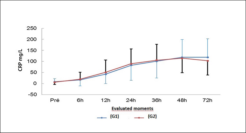 The US-CRP of the patients evaluated at each moment did not present statistical difference in the studied groups (P=0.867). The means of evaluations in Group 1 and Group 2 are represented in Figure 3.
