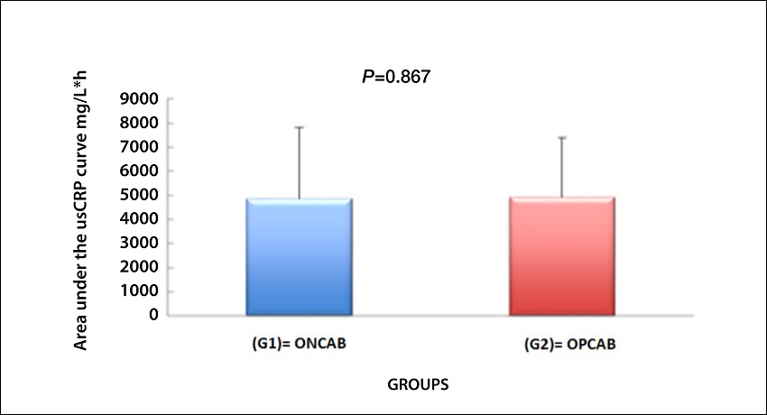 We analyzed the area under the US-CRP curve and the peak plasma concentration of CKMB and troponin (I) and there was no difference in these biomarkers in the postoperative period, either in Group 1 or in Group 2. Many inflammatory triggers could influence the US-CRP behavior.