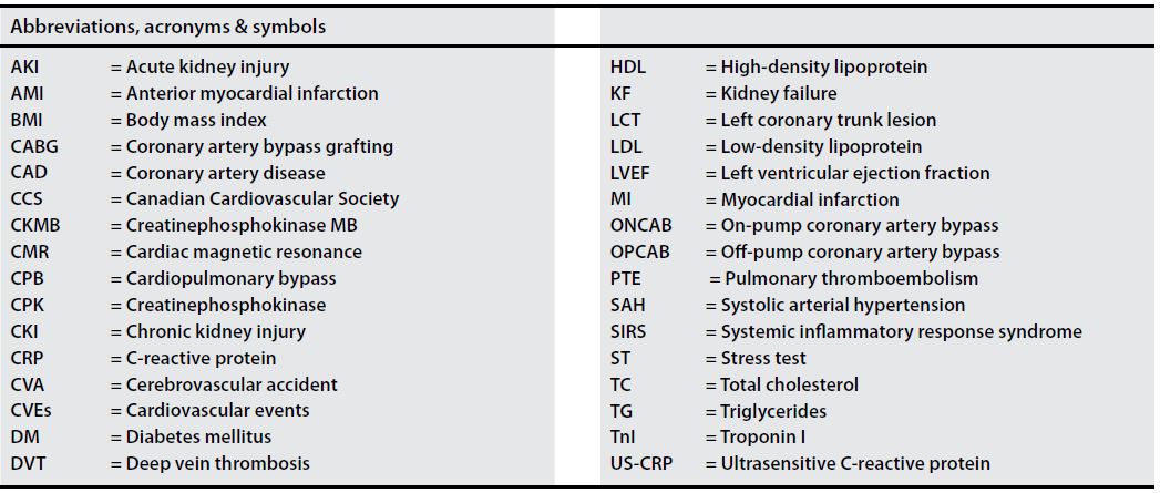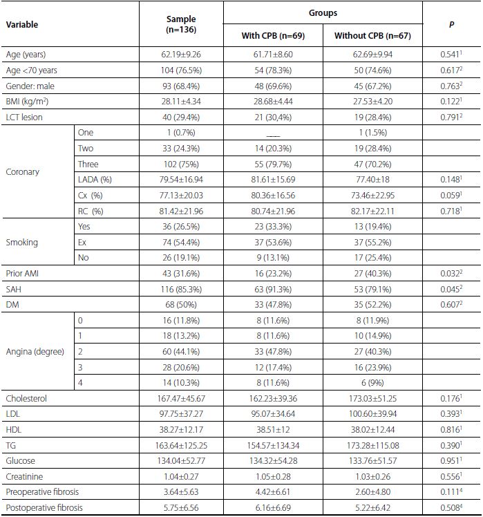 Methods: A prospective non-randomized clinical study with 136 patients was performed. Sixty-nine patients were enrolled for Group 1 (on-pump coronary artery bypass - ONCAB) and 67 patients were assigned to Group 2 (off-pump coronary artery bypass - OPCAB). All study participants had blood samples collected for analysis of glucose, triglycerides, creatinine, total cholesterol, high-density lipoprotein (HDL), low-density lipoprotein (LDL) and creatinephosphokinase (CPK) in the preoperative period. The samples of creatinephosphokinase MB (CKMB), troponin I (TnI) and US-CRP were collected in the preoperative period and at 6, 12, 24, 36, 48 and 72 hours after surgery. We also analyzed the preoperative biological variables of each patient (age, smoking, diabetes mellitus, left coronary trunk lesion, body mass index, previous myocardial infarction, myocardial fibrosis). All angiographically documented patients with >70% proximal multiarterial stenosis and ischemia, documented by stress test or classification of stable angina (class II or III), according to the Canadian Cardiovascular Society, were included. Reoperations, combined surgeries, recent acute myocardial infarction, recent inflammatory disease, deep venous thrombosis or recent pulmonary thromboembolism, acute kidney injury or chronic kidney injury were not included.