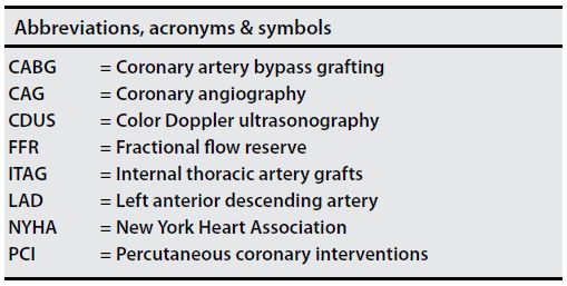 A cross-sectional examination, from the data of 494 patients who were subjected to FFR for LAD between January 2007 and January 2012, was conducted. In our institution, experienced interventional cardiologists and surgeons decide the severity of the lesion mostly by visual assessment, but FFR is performed in case of suspected moderate stenosis. The decision to perform CABG has been made for patients with a FFR value ≤0.80. Patients needing associated valve surgery and emergent CABG (defined as within 24 hours of the index procedure) were excluded. The 128 patients who underwent CABG at our hospital and who could be contacted by phone or by mail were invited for outpatient follow-ups; 30 of these invited patients responded to the calls and came for follow-up controls. Data concerning the variables were obtained from patients' medical records in the automation system, and from patient files. Patients were also examined according to the New York Heart Association (NYHA) functional capacity and the presence of angina, on arrival at the hospital for follow-up. Evaluation of angina was made according to standard guidelines recommendations as 'definite angina', 'probable angina', 'probably not angina' and 'definitely not angina'; and patients in the 'definite angina' and 'probable angina' group were considered as having angina[8]. All the patients were subjected to transthoracic echocardiography. Transthoracic CDUS was also performed in all the patients for the assessment of ITAG irrespective of the presence of symptoms. CAG was recommended to all patients who reported postoperative angina complaints during their outpatient follow-up visits.