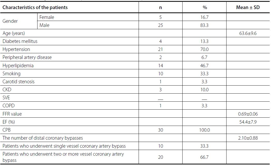 Methods: A total of 30 patients who underwent coronary artery bypass grafting depending on results of the fractional flow reserve between January 2007 and January 2012, were subjected to transthoracic color Doppler ultrasonographic evaluation irrespective of the presence of symptoms, and the presence of a systolic-diastolic flow pattern was investigated using the supraclavicular approach.