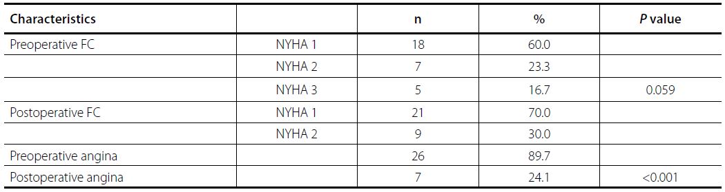 Preoperative and postoperative distribution and comparison of symptoms and functional capacities of patients are seen in Table 2. No statistically significant difference was found between the preoperative and postoperative functional capacities of the patients (P=0.059). However, patients were reported to have improved from their angina during the postoperative follow-ups (P<0.001). Angina complaints have been reduced significantly in patients with single-vessel bypass, as well as in those who underwent coronary artery bypass grafting in two or more vessels (P=0.008 and P=0.001, respectively).