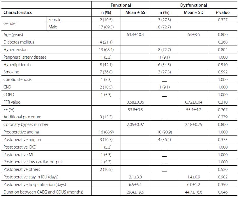 Results: The left internal thoracic artery graft was found to be functional in 63.3% of patients within a mean period of 35.1±19.7 months between coronary bypass and color Doppler ultrasonography. This period was found to be 29.4±19.6 months in the functional graft group, and 44.7±16.6 months in the dysfunctional graft group (P=0.046). Preoperative complaints of angina were reported to fall from 88.9% to 16.7% in the functional graft group, when compared to the postoperative period (P<0.001), but fell from 90.9% to 36.4% in the dysfunctional graft group (P=0.034).