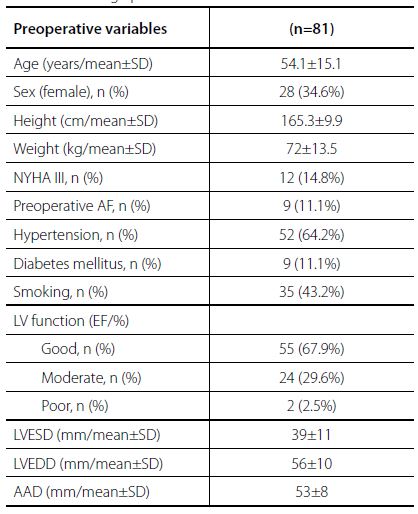 The patients were divided into three groups according to the aortic valve diseases. Group I (n=17) included patients with bicuspid valves, group II (n=30) was made up of patients with stenotic degenerative valves, and patients with aortic valve regurgitation constituted group III (n=24). The mean follow-up periods were 46.59±12.64 months, 69.20±38.42 months and 58.50±23.29 months for groups I, II and III, respectively. Preoperative findings of the patients are summarized in Table 1. Of the 81 patients, 53 (65.4 %) were male and the mean age was 52.84±15.53 years. Twelve (14.8%) patients were in New York Heart Association (NYHA) functional class III and there were two patients with poor left ventricular function.