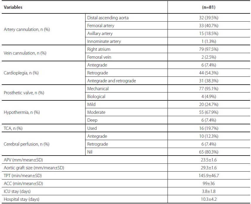 Operative data are shown in Table 2. The aortic valve was replaced by a tissue valve in 4 (4.9%) patients, and a mechanical valve in 77 (95.1%) patients. The mean size of the replaced valve was 23.50±1.6 mm. All patients received a Dacron graft with a mean size of 29.3±1.6 mm.