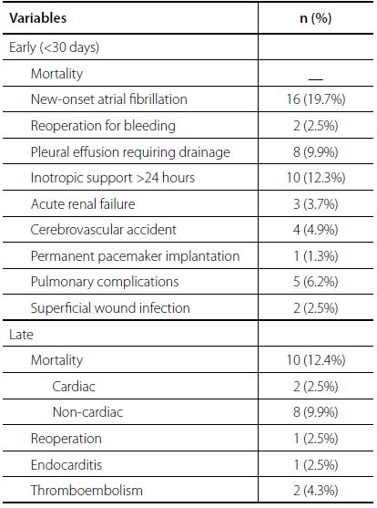 Late follow-up was obtained in 71 patients with a mean of 60±30.1 months postoperatively. Mortality developed in 10 (12.4%) patients, 8 (9.9%) due to non-cardiac reasons. Only one (2%) patient needed reoperation because of infective endocarditis.