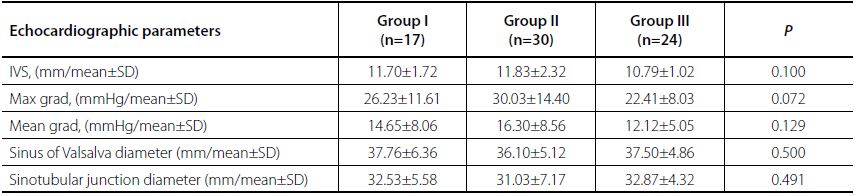 Postoperative echocardiographic parameters, such as the interventricular septum, the maximum and the mean transvalvular gradient across the aortic valve, and sinotubular junction and sinus of Valsalva diameters for each group are presented in Table 4.