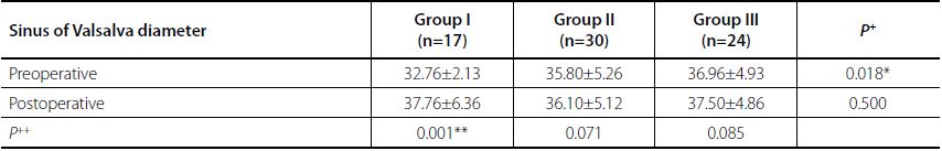 There was no significant difference among the groups in the postoperative sinus of Valsalva diameter (P>0.05) (Table 4). The increase in postoperative sinus of Valsalva diameter compared to preoperative size in Group I was statistically significant (P<0.01). There was no significant change in postoperative sinus of Valsalva diameter compared to preoperative size in Groups II and III (P>0.05) (Table 5). The postoperative increase in the sinus of Valsalva diameter, compared to preoperative size in the Group I, was significantly higher when compared to Group II and Group III (P<0.01).