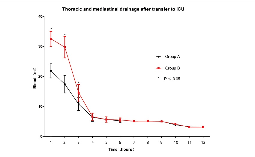 Results: The hourly blood loss in the Group A was generally lower than in the Group B at first 3 hours, which has significant difference (P<0.05). However, there was no difference after 3 hours between the two groups. Operative time, intraoperative blood loss, mediastinal blood loss, transfusion requirements, and drainage in the first postoperative 12 hours in the Group A were lower than in Group B, which has significant difference (P<0.05).
