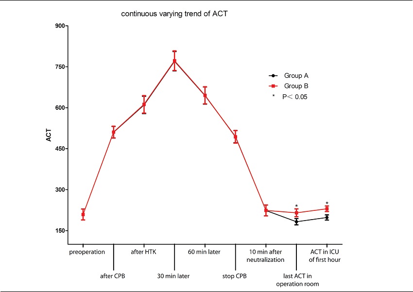 The lower ACT has an effect on reducing mediastinal blood loss. As shown in Figure 2, the hourly blood loss in the low ACT group was generally lower than in the Group B in the first 3 hours, which has significant difference (P<0.05). However, there was no difference after 3 hours between the two groups.