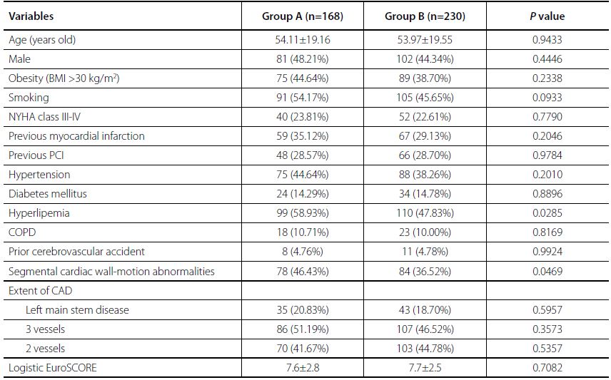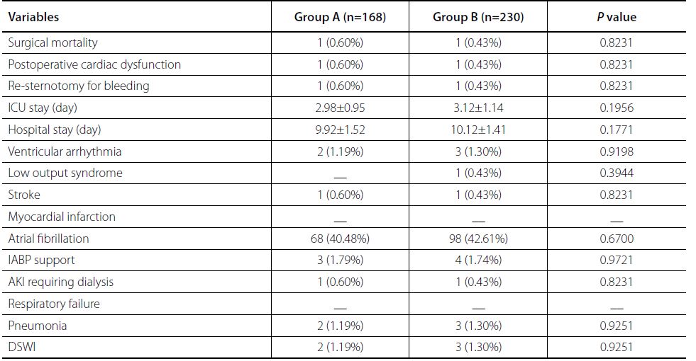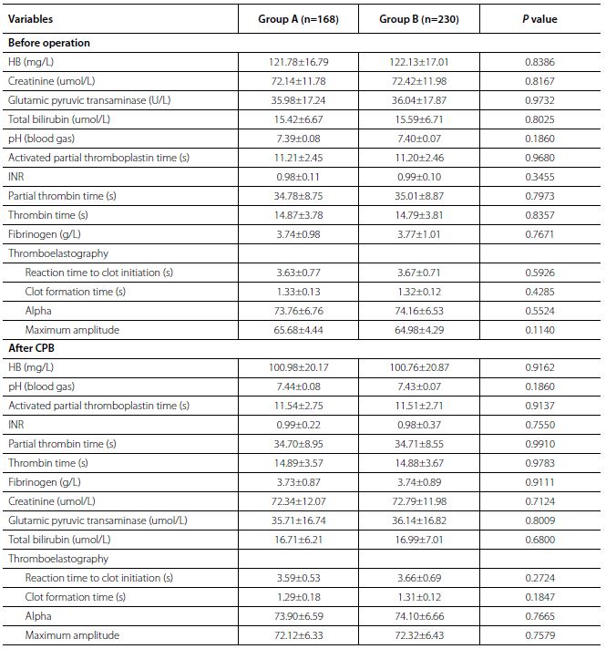 Intraoperative data are shown in Table 3. There was no statistical difference between the two groups including preoperative ACT, CPB time, cross-clamp time, number of distal anastomosis, ACT after CPB, cases who need additional protamine, and the additional quantity of protamine (P>0.05). However, the last ACT in the operation room, hemostatic time, intraoperative blood loss, and erythrocyte suspension presented statistical difference between the two groups (P<0.05).