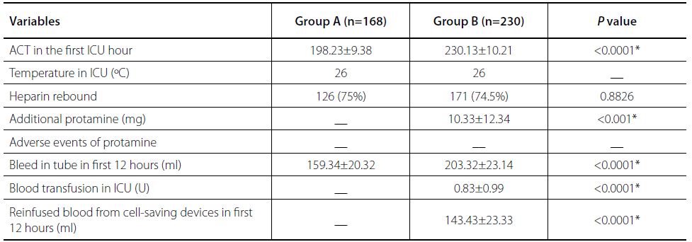 The ACT in the first ICU hour presented statistical difference between the two groups (P>0.05). Despite neutralizing the ACT to baseline level after surgery, there was a reappearance of anticoagulant activity indicative of heparin rebound as demonstrated by ACT higher than the previous. So, the number of patients requiring small amounts of protamine to control excessive bleeding was higher in the Group B, which has statistical significance (P>0.05). Most patients received a small dose (25 mg) of protamine. Blood in tube in the first 12 hours, blood transfusion in ICU, and reinfused blood from cell-saving devices in the first 12 hours also presented statistical significance in the two groups (P>0.05) (Table 4).