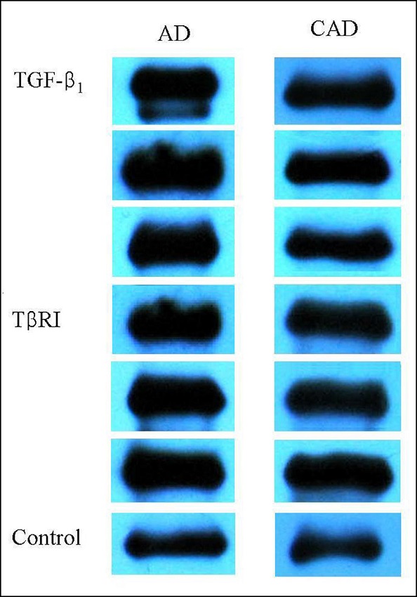 Methods: Twenty consecutive aortic dissection patients and 20 consecutive coronary artery disease patients undergoing a surgical treatment in this hospital were enrolled into this study. The aortic tissues were sampled and the TGF-β1 and its receptor TGF-β receptor I (TβRI) were detected by Western blotting assay.