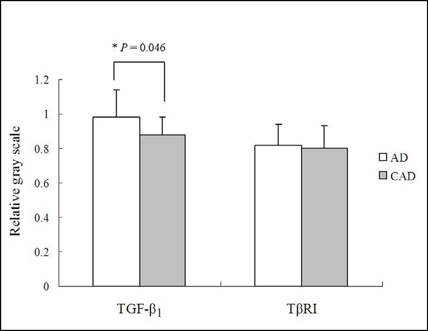 TGF-β1 and TβRI were positively expressed in the aortic tissues of patients of both AD and CAD groups (Figure 1). The TGF-β1 expression in the aortic tissue of AD patients was significantly higher than that of CAD patients. The relative gray scale of the TβRI expression was much higher in AD patients than in CAD patients; however, no significant difference was reached (Figure 2).