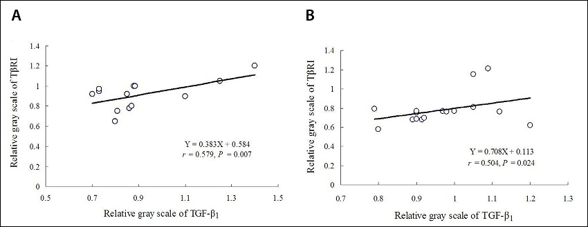 There was a direct correlation between TGF-β1 and TβRI expressions in the AD group (Y=0.383X + 0.584; r²=0.335, r=0.579, P=0.007); and there was a significant direct correlation between TGF-β1 and TβRI expressions in the CAD group (Y=0.708X + 0.113; r²=0.254, r=0.504, P=0.024) (Figure 3). The coefficient was stronger in AD group than in CAD group.