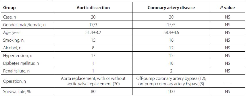 Twenty consecutive patients with AD receiving an ascending aorta replacement in this hospital were included in the study group (AD group). Twenty patients with CAD referred to this hospital for coronary artery bypass grafting were taken as controls (CAD group). Totally, 25 patients (including all 20 patients from the AD group and 5 patients from the CAD group) were operated on an urgent basis, and 15 patients of the CAD group received an elective operation. The patients' information is shown in Table 1.