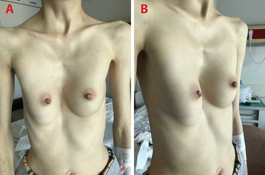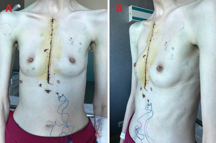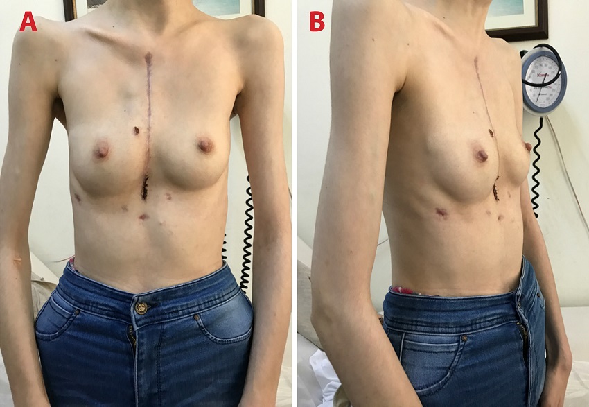 A vertical midline incision on skin, subcutaneous tissues, and pectoralis fascia was made over the sternum. Following elevation of pectoralis muscles from the anterior chest wall, a median sternotomy was performed. Costal cartilages of the 3rd to 8th ribs were removed. The right lung was retracted from the midline. Cardiopulmonary bypass (CPB) was initiated via ascending aortic and bicaval cannulation, and cardiac arrest was obtained. We did not use topical cardiac hypothermia to prevent phrenic nerve injury. Both atria were relatively easy to expose due to leftward shift and rotation of the heart. A mitral valve replacement and a tricuspid ring annuloplasty was performed using biatrial approach. CPB was terminated. A bar was placed behind the sternum and fixed to the pectoralis muscle fibers bilaterally. After completion of the Ravitch procedure, the sternum was closed. The patient was transferred to a dedicated cardiac surgery intensive care unit and she was successfully extubated at the postoperative 6th hour. Her recovery was uneventful and she was discharged on postoperative day 9 (Figures 3A and B).