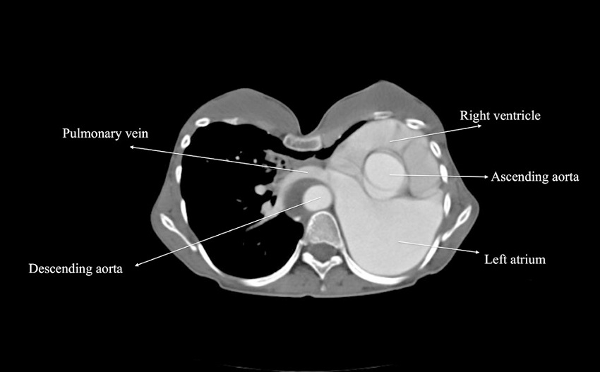 Transthoracic echocardiogram revealed severe mitral regurgitation due to myxomatous mitral valve with bileaflet prolapse and chordal elongation, secondary pulmonary hypertension, and tricuspid regurgitation with a dilated right atrium. Her ejection fraction was 35%, left ventricle end-diastolic diameter was 72 mm, and end-systolic diameter was 59 mm. She also had a borderline ascending aortic aneurysm measuring 40 mm in diameter. Pulmonary function test demonstrated reduced forced vital capacity (FVC), 1.11 L (31.7% of predicted), and reduced forced expiratory volume in 1st second (FEV1), 1.05 L (34.6% of predicted). A contrast-enhanced computed tomography (CT) scan was performed to examine the mediastinal structures and alternative cannulation sites (Figure 2). Heart and great vessels were displaced to the left, and the right lung was enlarged and crossing the midline, anterior to the heart. The proxymal ascending aorta was 40 mm in diameter. Additionally, a chronic type B aortic dissection was present. CT scan revealed that the ascending aorta and the superior and inferior venae cavae were suitable for cannulation.