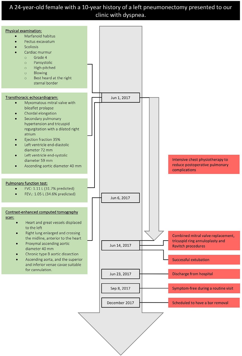 Methods: We performed a mitral valve replacement combined with a Ravitch procedure in a young female with previous left pneumonectomy and pectus excavatum.