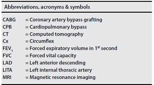 Six months after pneumonectomy, FVC decreases by 36% and FEV1 by 34%. These parameters do not significantly improve beyond 6 months[2]. Considering that the pulmonary function may deteriorate significantly after cardiac surgery even in patients who have normal preoperative respiratory function, previous pneumonectomy poses a great risk of postoperative pulmonary complications[35]. Hulzebos et al.[36] found preoperative inspiratory muscle training to be effective in preventing postoperative pulmonary complications in high-risk patients undergoing elective CABG surgery. Conventional measures such as avoidance of phrenic nerve injury and fluid overload, early extubation, early mobilization, and postoperative chest physiotherapy should be utilized. Central venous line should be placed on the side of the pneumonectomy to avoid pneumothorax.