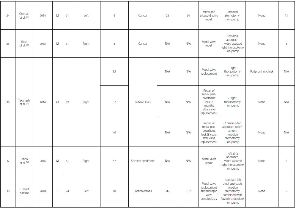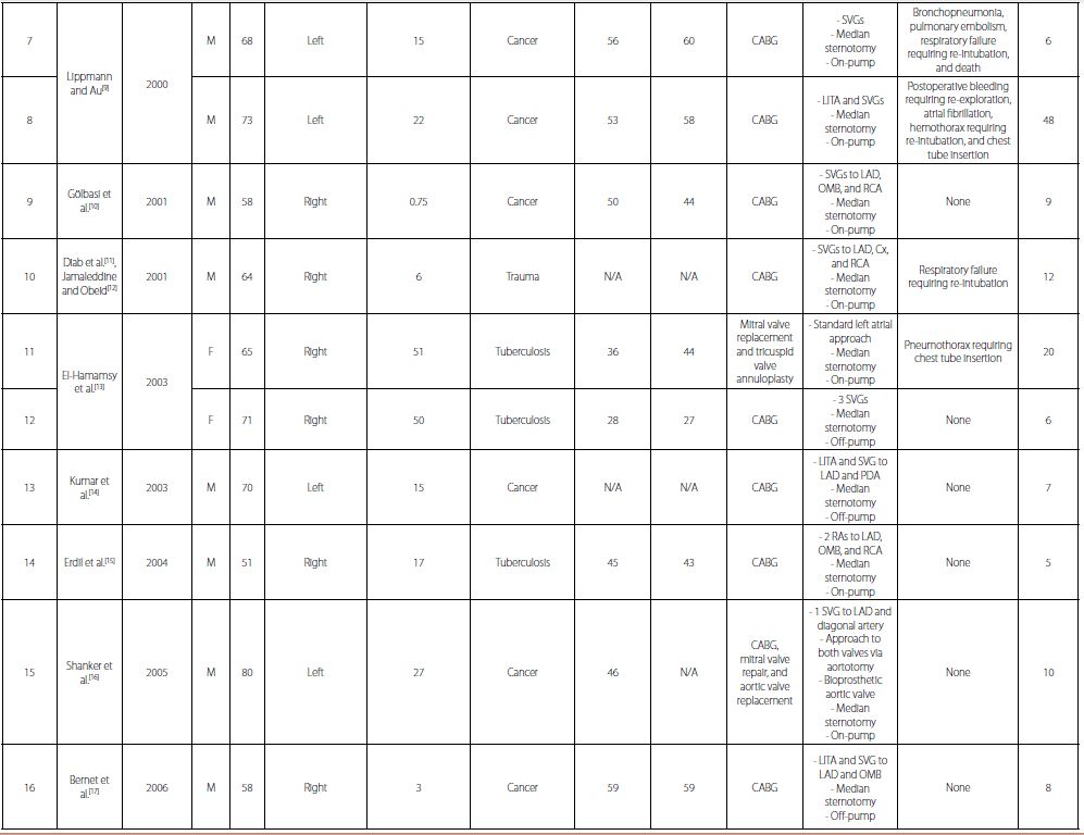 After conducting a Medline search from 1966 to April 2018 using the search terms "pneumonectomy" and "open heart surgery" or "coronary artery bypass" or "mitral valve" or "aortic valve" or "revascularization", we identified 30 articles in English language[3-34]. A total of 42 cardiac operations were performed on 38 patients, including the current one (Table 1). The mean patient age was 65.2 years (range: 24-83 years). Twenty-one (76.3%) patients were male. There were 20 (47.6%) isolated coronary artery bypass grafting (CABG) procedures, 18 (42.8%) valvular procedures, and 4 (9.5%) combined CABG and valvular procedures. Two of these operations were transapical aortic valve implantation procedures (patients 29 and 30)[26,27].