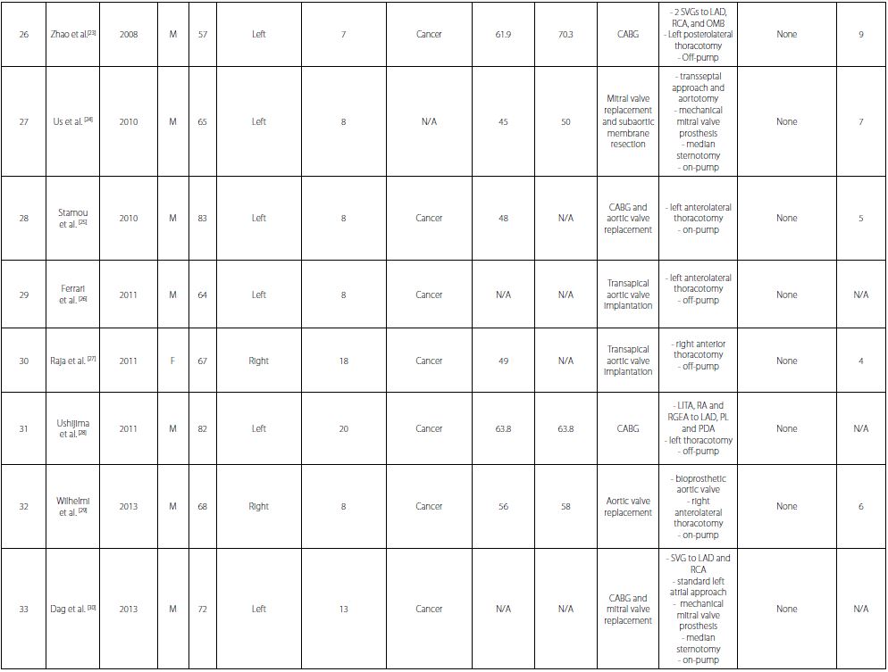 The preferred surgical incision was a median sternotomy in 26 (61.9%) cases, a left thoracotomy in 9 (21.4%) cases, a right thoracotomy in 6 (14.2%) cases, and it was not specified in 1 (2.3%) case. Patients 35 and 37 underwent surgery utilizing video-assisted right thoracotomy[32,34]. Among 24 CABG operations, a left internal thoracic artery was used as a bypass conduit in 7 (29.1%) cases. The use of a right internal thoracic artery was not reported. Complete arterial revascularization was performed in 2 (8.3%) cases. Among 20 isolated CABG operations, 7 (35%) were carried out without the use of CPB.