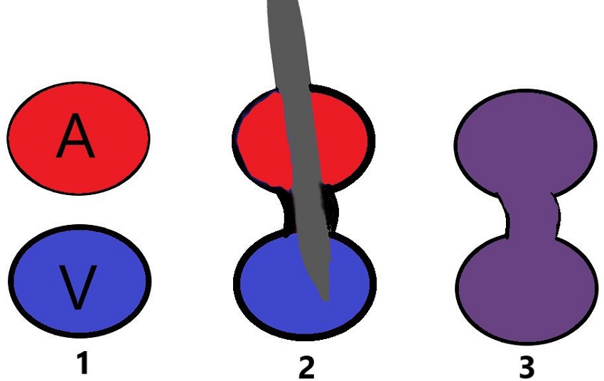 Currently, coronary angiography (CAG) is the most effective method for diagnosis and treatment of coronary artery disease. Like every interventional procedure, some complications may arise even if the operator experience is sufficient during the CAG. Femoral arteriovenous fistula (AVF) rates varying between 0-0.08% have been reported in patients undergoing cardiac catheterization[1,2]. Arteriovenous fistula can be caused by simultaneous drilling of both arteries and veins by needle (Figure 1). Other adverse events after CAG include hematoma, pseudoaneurysm, dissection, embolism, infection, and extremity pain.