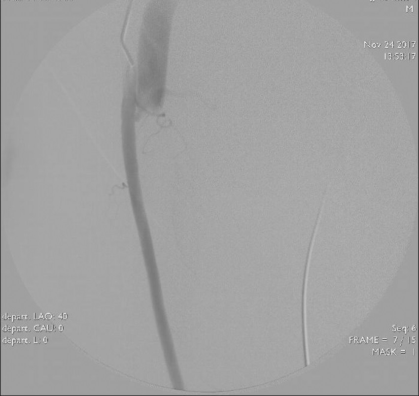 After consultation of interventional radiology, endovascular treatment was decided. Under local anesthesia, the right femoral artery was reached, and the right lower extremity angiograms were obtained after appropriate manipulations. A fistula was located between the superficial femoral arter and the superficial femoral vein (Figure 2). The femoral vein was reached after passing through the fistula tract. The catheter was then withdrawn slowly to try to embolize with cyanoacrylate (glue). However, the glue could not be stabilized due to the high flow. Although the balloon catheter was inflated for a long period with low pressure in the fistula region, the flow to the vein via fistula could not be prevented. Then, the patient was informed about the endovascular stent. However, the patient preferred a surgical intervention instead of stenting.