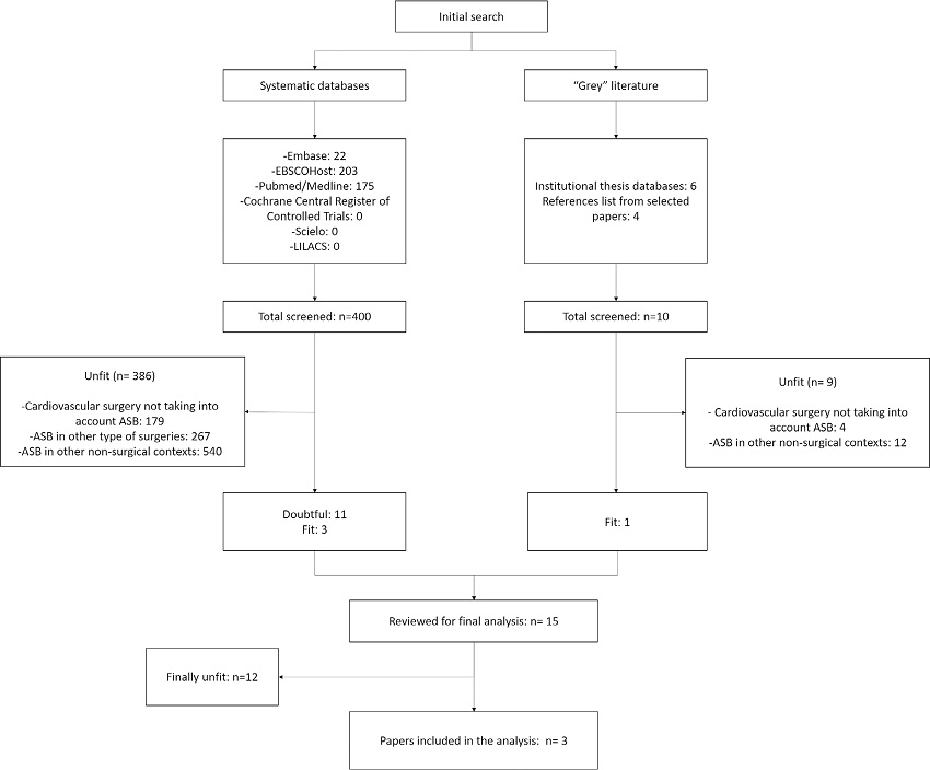 The present systematic review and meta-analysis was conducted in accordance with the Cochrane Handbook for meta-analyses and systematic reviews and the PRISMA (Preferred Reporting Items for Systematic Reviews and Meta-analyses) Statement. The literature search was performed by two authors using the databases Medline, Embase, PubMed, EBSCOHost, SciELO, LILACS and the Cochrane Central Register of Controlled Trials using the following terms: asymptomatic bacteriuria; bacteriuria; nitrites; pyuria; asymptomatic leukocyturia; urine analysis; urinalysis; cardiac surgery; heart surgery; cardiovascular surgery; cardiothoracic surgery. Eligible studies corresponded to randomized controlled trials, cohorts and case-control studies that evaluated the benefit of treating ASB in patients taken to cardiovascular surgery. Also, the studies included had to be written in in English, Spanish or Portuguese, published after January 1st of 1970 and had to be available on full text. The reviewers evaluated the title at first, excluding those without any correlation with the objective of the study, then the abstracts were reviewed, removing the duplicates, finally the suitable articles were selected for full text review. For outcomes with suitable data for combination, results were meta-analyzed using Review Manager 5.3 (Nordic Cochrane Center, Cochrane Collaboration 2009, Copenhagen, Denmark).