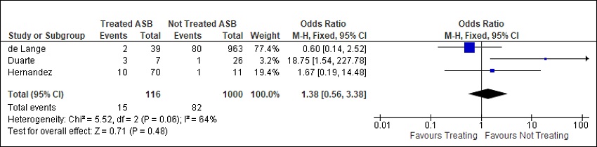 After the initial search, 410 articles were identified, being 407 excluded for not being related to the study's objective (Figure 1). Three studies involving a total of 1116 patients were included, being the individuals mainly males (47.4%), with a mean age at the procedure of 67.4 years. The procedures performed corresponded to non-valvular coronary artery bypass grafting (CABG) in 473 (42%) patients, valvular replacements in 567 (51%) cases and thoracic aortic surgeries in 76 (7%) patients. Regarding the treatment, 116 patients had specific antimicrobial treatment before the surgical procedure, having these patients a higher rate of SSI when compared to the ones not treated (12.9% vs. 8.2%), however, this result did not achieve a statistically significant value (P=0.086). To compliment this finding, a random effects model meta-analysis was performed to evaluate the benefit that treating bacteriuria may confer regarding SSI risk. A moderate heterogeneity was observed (I2=64%) among the included studies, encountering a not significant effect of the antimicrobial intervention over the infectious complications chosen (OR 1.38; 95% CI 0.56, 3.38) (Figure 2).