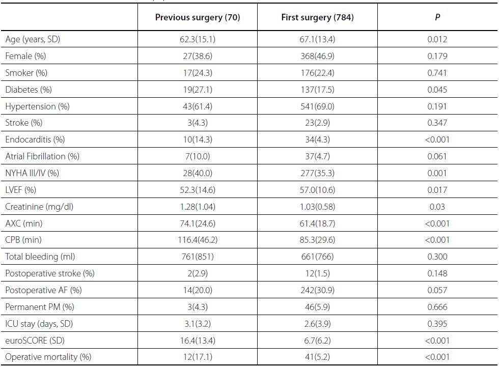 Results: The PCS and first-time surgery (FTS) groups had significant differences in base-line characteristics (PCS group were older, higher incidence of hypertension, endocarditis, NYHA III/IV, lower LVEF, higher creatinine and higher EuroSCORE). In the unmatched population, patients with PCS had higher operative mortality (17.1% vs. 4.6%, P=0.001). In the PM groups, this difference was not significant (12.5% and 3.6%, P=0.08). The only independent predictors for operative mortality found in the PCS group were age and fe-male gender. Age and diabetes were identified as the only independent predictors of sur-vival.